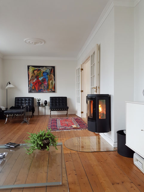 I dette klassiske hjem ønskede kunden en brændeovnsløsning, der ikke var dominerende. Derfor faldt valget på en væghængt brændeovn, som giver et let og luftigt udtryk i boligindretningen. Nu spreder brændeovnen varme og hygge på kolde og kølige aftner, når familien er samlet. Kombinationen af stort glas i lågen og glas i siderne betyder, at bålet kan ses fra hele dagligstuen.